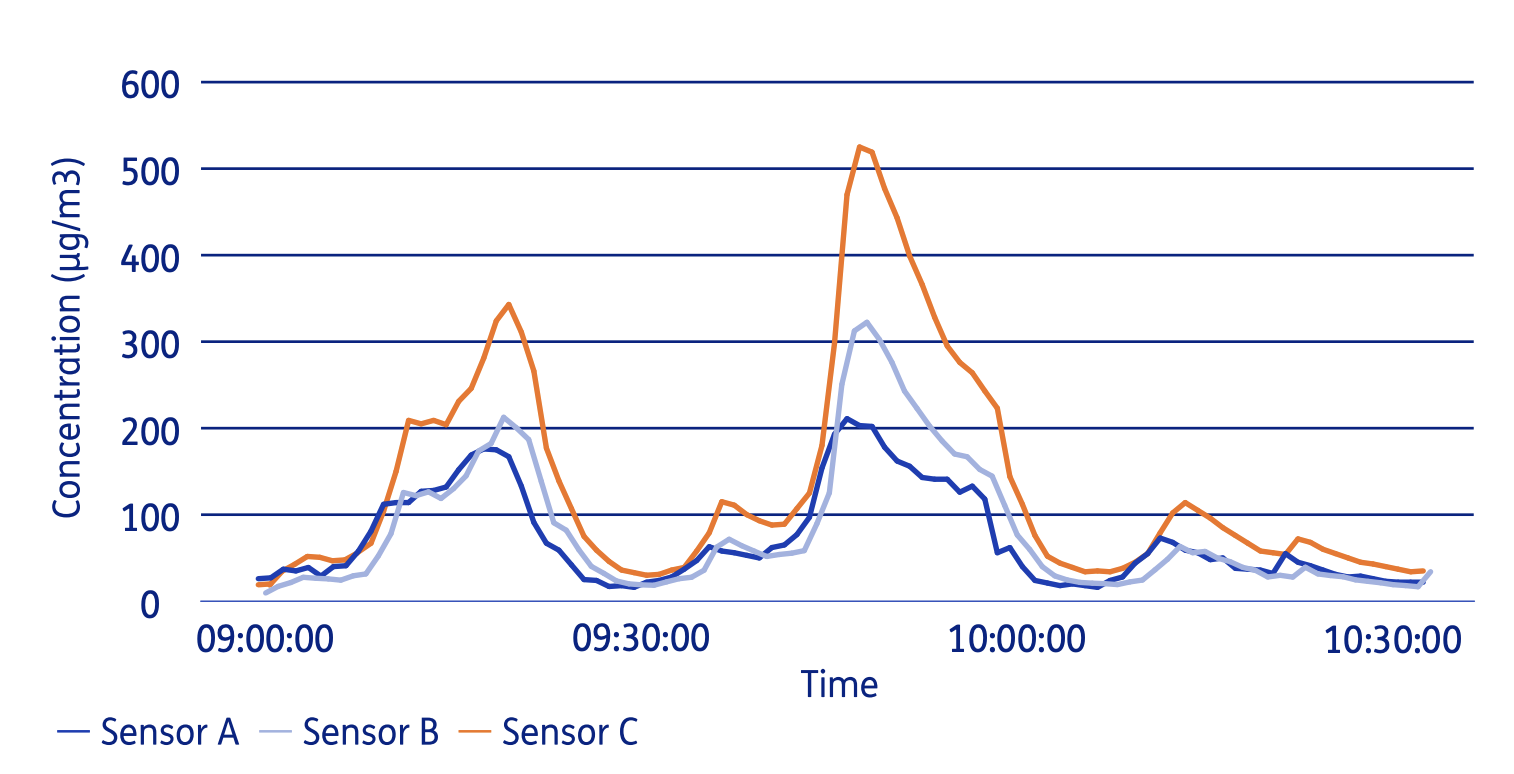 Sensors will definitely improve the options we have, for example allowing for implementing control measures the very moment exposures occur (called real-time risk-management). However, there are also some improvements possible. TNO’s research shows that sensors give consistent and correct results for measurements over time, but – like all measuring systems – they have some uncertainty (see figure below). This uncertainty is different for each substance. Sander explains: “At the moment, we are doing research on welding fumes. We want to know the exact uncertainty and calibrate the sensors for this substance, with the hope that the calibrated sensors can be used for compliance testing. Right now, one sensor cannot yet be used for many different substances.”